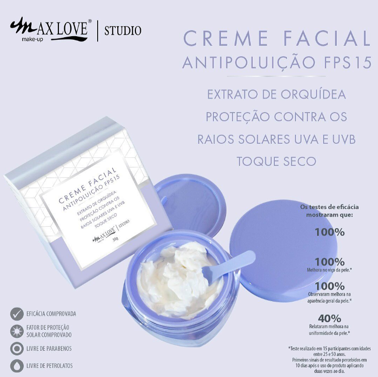 O creme facial antipoluição fps15 max amor auxilia na proteção da pele do rosto contra os raios uva e uvb, auxiliando no retardamento do enchecheimento da pele, além de diminuir os riscos de manchas.